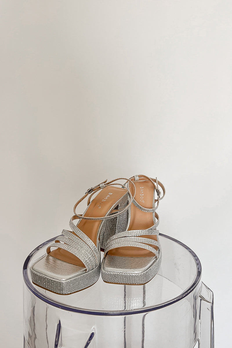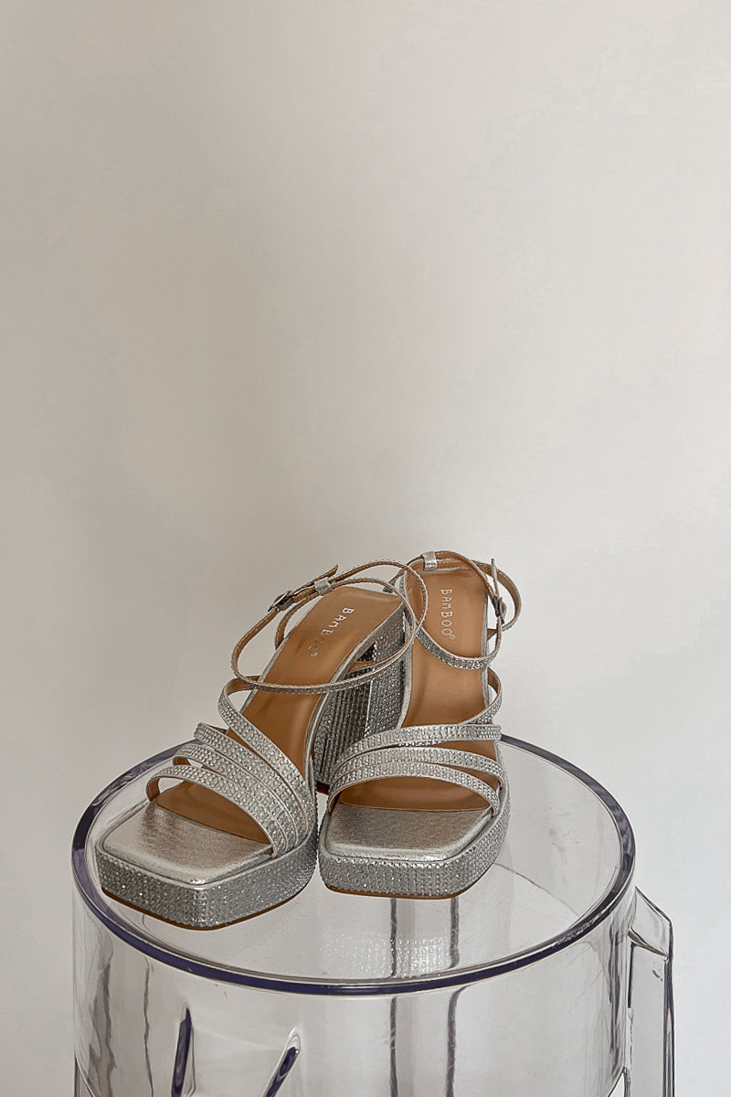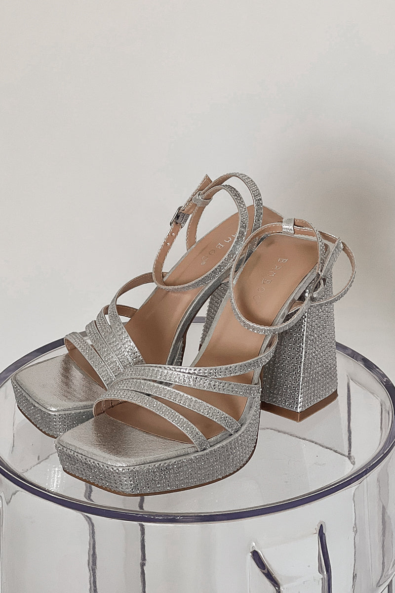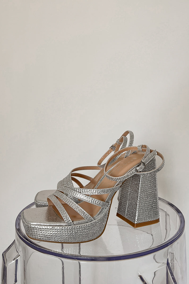 Dance the night away in the Luna Rhinestone Platform Heels! These gorgeous shoes feature a metallic silver finish with rhinestones all over, a strappy design, high block heel. Pair these shoes with a for a glam look!
