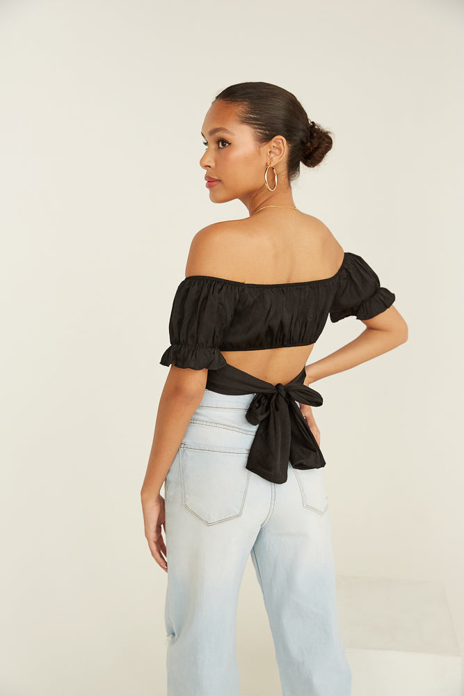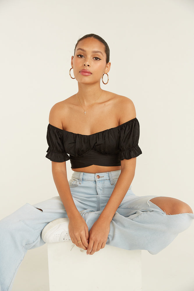 Lookin' cute in the Mara Puff Crop Top! Featuring a sweetheart neckline with a ruched bust, short puff sleeves with a ruffle trim, and a wrap waist tie for a flirty final touch. Available in pink and black. Complete your look by accessorizing with the .
