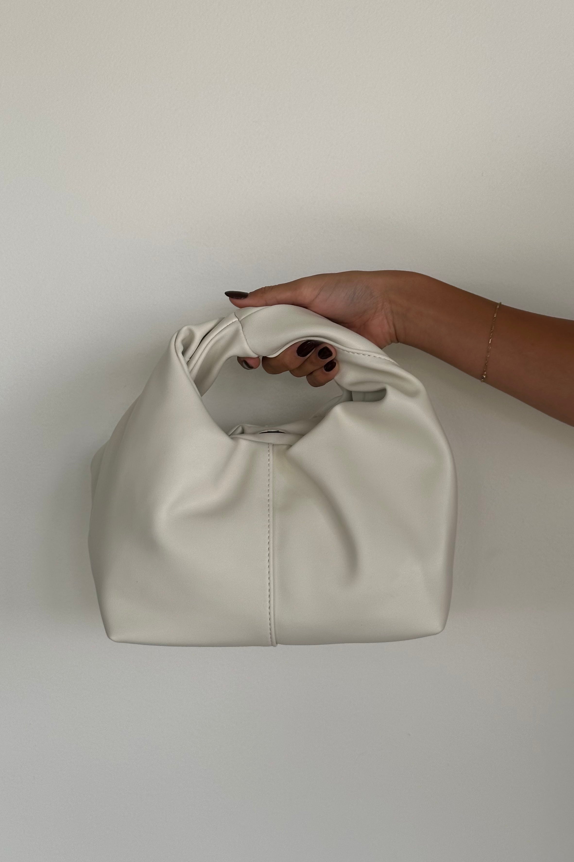 Introducing the Misty Handle Bag: a soft, semi-structured rectangular bag with a wide base, featuring two inner compartments, including a zip pouch. The top opening has a magnetic clasp closure, and the bag is highlighted by a statement wrap handle. Finished with a cotton inner lining, it combines practicality and style! Available in Bone; style with a new !