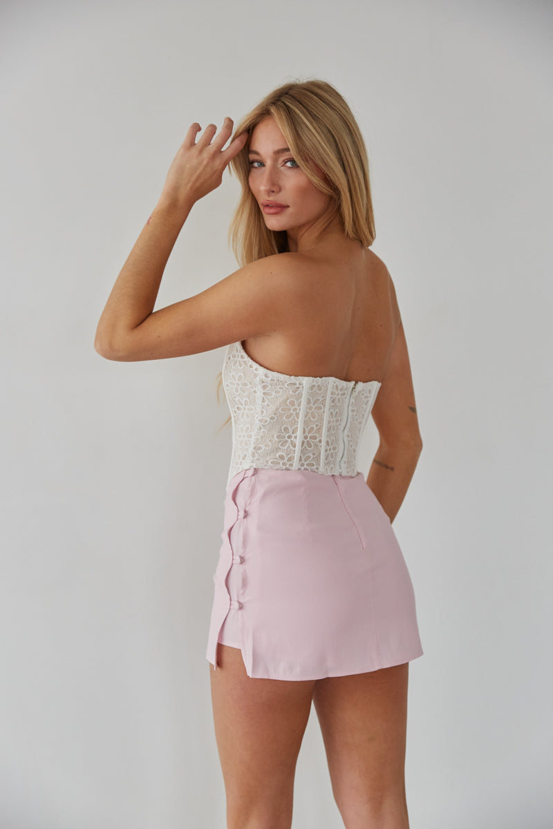 Call it a crush, but we're falling hard for the Nalani Strapless Lace Corset! This adorable top features a floral lace overlay, hook and eye closure, and boning for structure. Pair with the to complete the look!