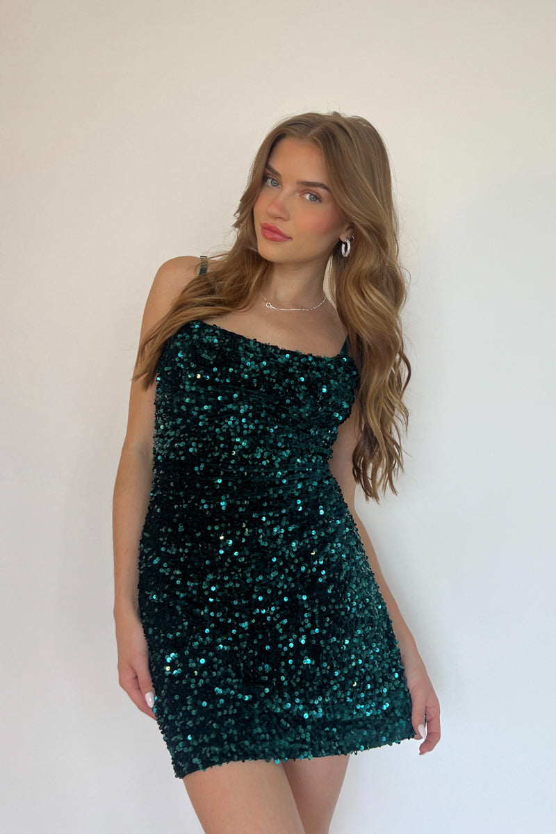 Ready to party in the Tori Velvet Sequin Mini Dress! This dark green beauty features all over sequins, a subtle scoop neckline, and a bodycon silhouette. Throw on your favorite pair of and you'll be ready to dance!