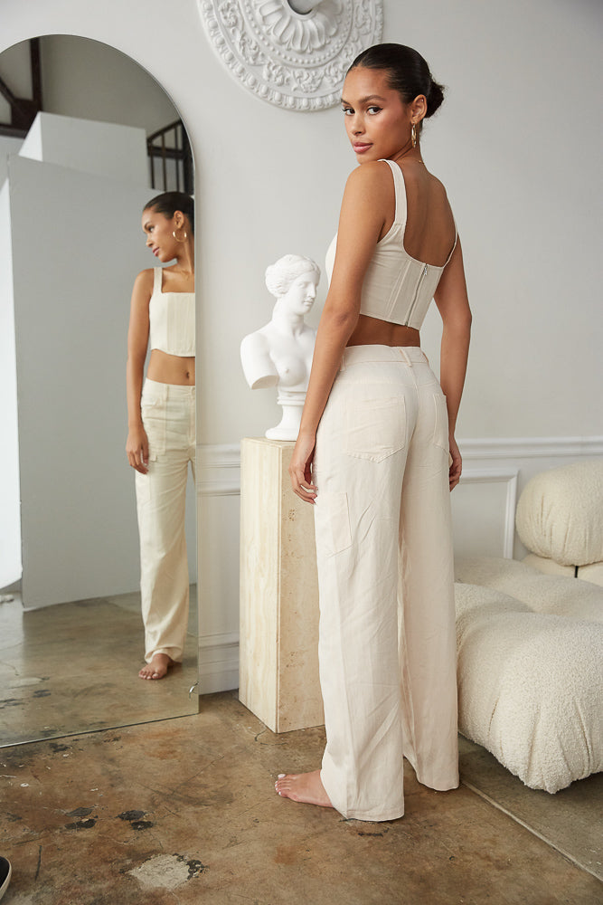 Hey cool girl, meet the Toronto Carpenter Pants! Featuring a high rise fit, a baggy wide leg silhouette, and extra loops and pockets for a laid back look. Available in ivory. Pair with the to make this look a set.